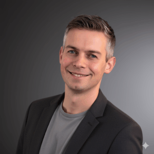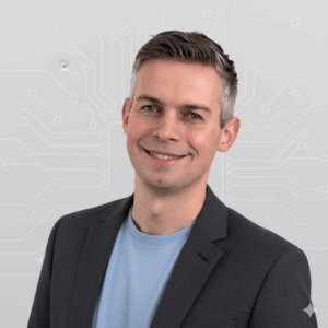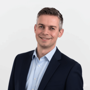 Verander mijn foto in een strak portret van een technologische startup: lichtgrijze achtergrond met subtiele digitale textuur, heldere belichting, een strak, nette casual jas en een zelfverzekerde maar vriendelijke uitdrukking.