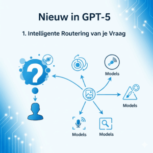 Maak een infographic Titel: Nieuw in GPT-5 1: Routering van je vraag 2: Gratis toegankelijke redeneermodellen 3: Minder hallucinaties Vul zelf details in en vul aan met visuals. Maak het in het Nederlands, en let op de kloppendheid van de teksten.