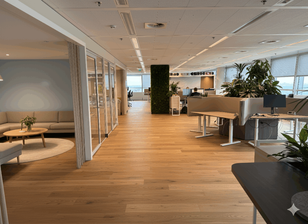 Ik wil graag een houten vloer op de hele verdieping. In het midden van de ruimte een groene mosmuur die de werkeilanden scheidt. De linker ruimte graag lage beige zitbanken en een frisse kleur op de muur.
